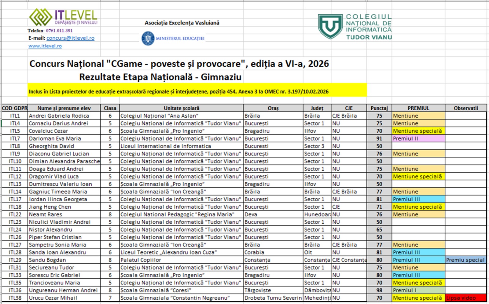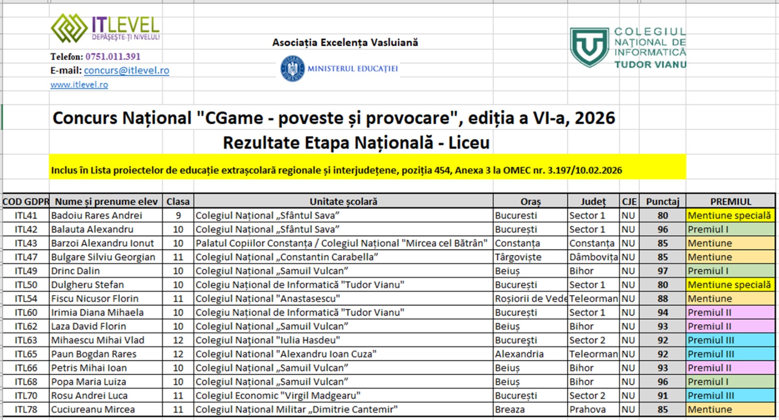 Colegiul Național de Informatică „Tudor Vianu” din București, Centrul Educațional de Excelență ITLevel și Asociația Excelența Vasluiană organizează gratuit Concursul Național „CGame – poveste și provocare”, ediția a VI-a.